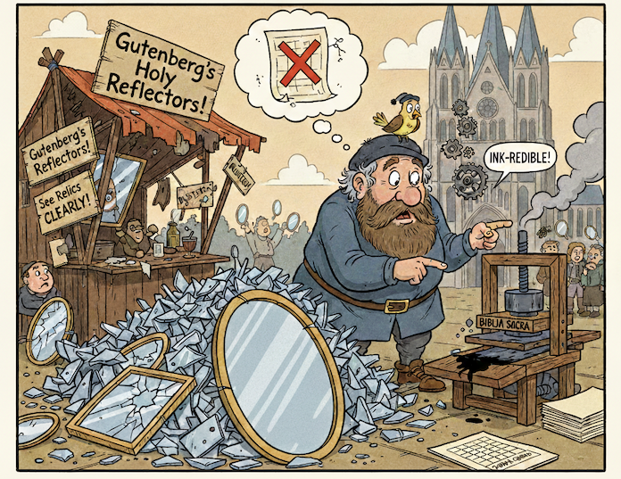 Gutenberg and his partners were stuck with a warehouse full of mirrors and no pilgrims to sell them to for at least another year. The investment was spent.